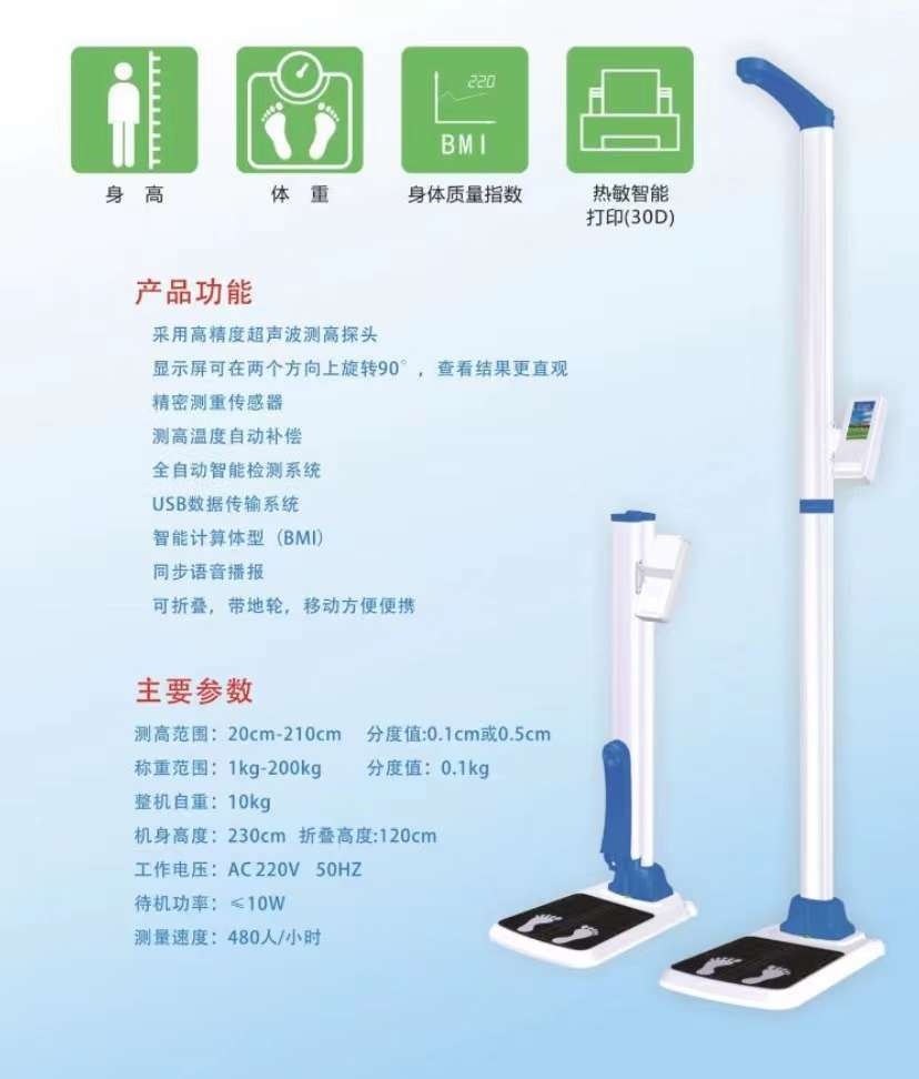 产地:北京|品牌:京海|参数:1.直接测量人体的身高体重,反映被测者身体匀称度和发育形态指数(BMI); 2.身高测试身高触头采用可折叠式设计。 3.体重底座采用全铝材质一体化压铸成型,体重使用高精度体重传感器,测试精度高,耐疲劳、寿命长。 4.测试仪采用3.5吋真彩TFT LCD液晶显示屏显示测试值(身高体重数值及BMI指数),界面美观,操作简单。 5.测试仪具有同步语音播报身高、体重测试数值功能,语音播报可设置开启或关闭。 6.主要技术参数: 测量范围: 身高:50cm~210cm 体重:5kg ~150kg 分度值:身高:0.1cm 体重:0.1kg 误差:身高:±0.2cm 体重:±0.1kg 工作环境:0℃ ~ 40℃湿度<90% 存储环境:-10℃ ~ 50℃湿度<75%