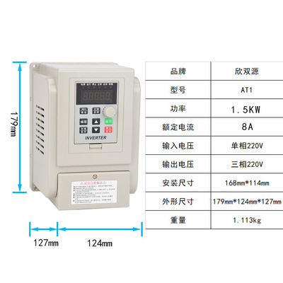 货源类别产地:广东|是否进口:否|订货号:AT1-1500X|品牌:欣双源|货号:AT1-1500X|型号:AT1-1500X|产品系列:AT|应用范围:通用|电源相数:单相|额定电压:单相/三相AC220(V)|供电电压:低压|适配电机功率:1.5(kW)|滤波器:不带滤波器|直流电源性质:电流型|控制方式:V/F开环|输出电压调节方式:PWM控制|营销方式:厂家直销|额定电流:8(A)|物料编号:XSY-AT|外形尺寸(宽x高x厚):117.5*167.5*144(mm)(mm)