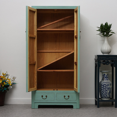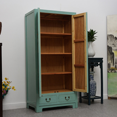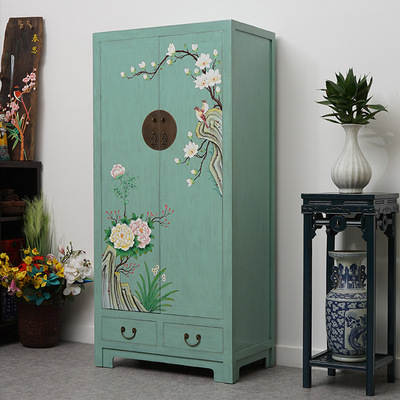 中式榆木储物柜复古单人绿色衣柜仿古彩绘高柜整体收纳装饰橱定制 |